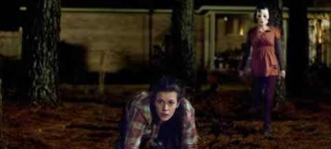 The story is a simple one. A young couple, Kirsten and James, return to their vacation home late one evening and continue their argument from earlier. They are interrupted by a knock at the door and greeted by a young girl asking if her friend is there from the shadows. When they reply no, she leaves and their argument continues with James leaving to get some air and take a drive to get some cigarettes. Not long after he leaves, the girl returns to knock at the door but this time she has brought some friends. This simple premise sets up an extremely suspenseful hour that will have you on the edge of your seat and cowering in fear.